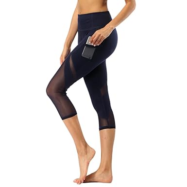 Women S High Waist Capri Workout Yoga Leggings Running Pants Mesh Panels With Pockets Navy Ca185w9kc9u