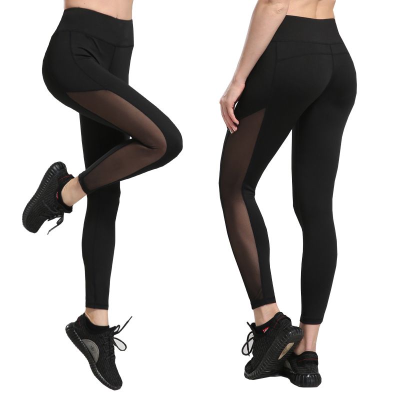 New Sexy Women Sporting Leggings Black Mesh Splice Side Pocket Fitness Slim Leggings Pants Workout Clothes Ropa Mujer