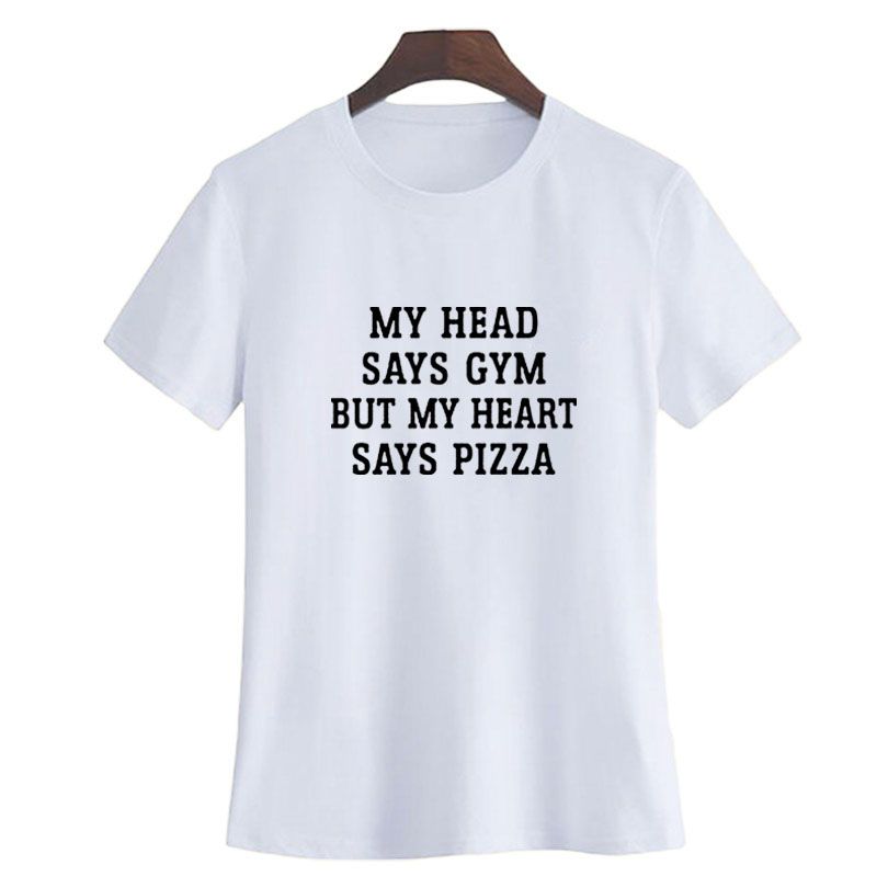 Women S Tee My Head Says Gym But My Heart Says Pizza Funny Workout T Shirt Fashion Women Clothing Summer New T Shirt Tumblr Hipster Sayings