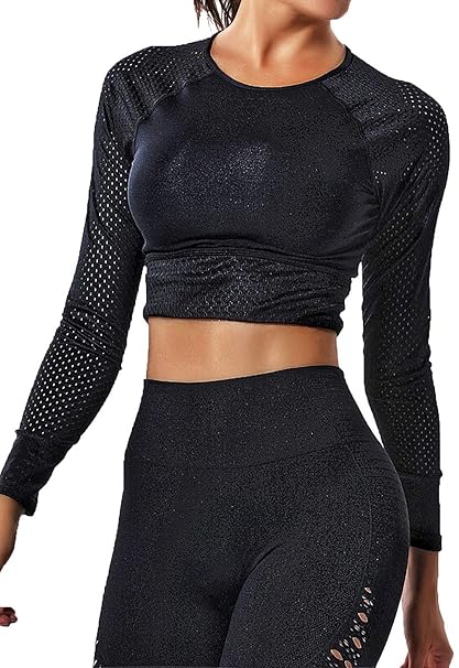 Black Sport Crop Top For Women With Thumb Holes Long Sleeve Hollow Seamless Shirts Running Fitness Workout