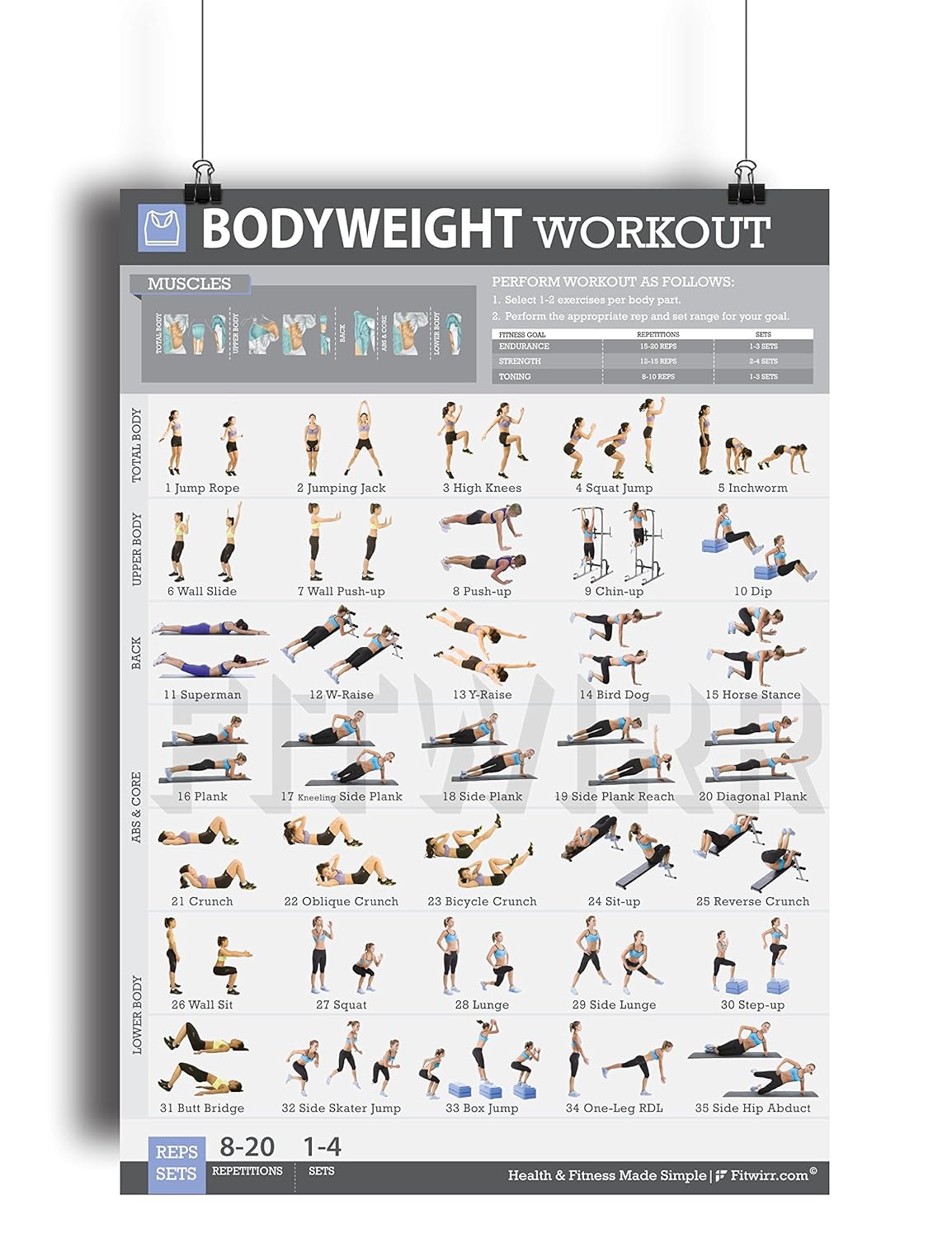 Bodyweight Exercise Poster Total Body Fitness Laminated Home Gym Workout Poster Bodyweight Exercises Tone Your Legs Arms Abs Core Butt